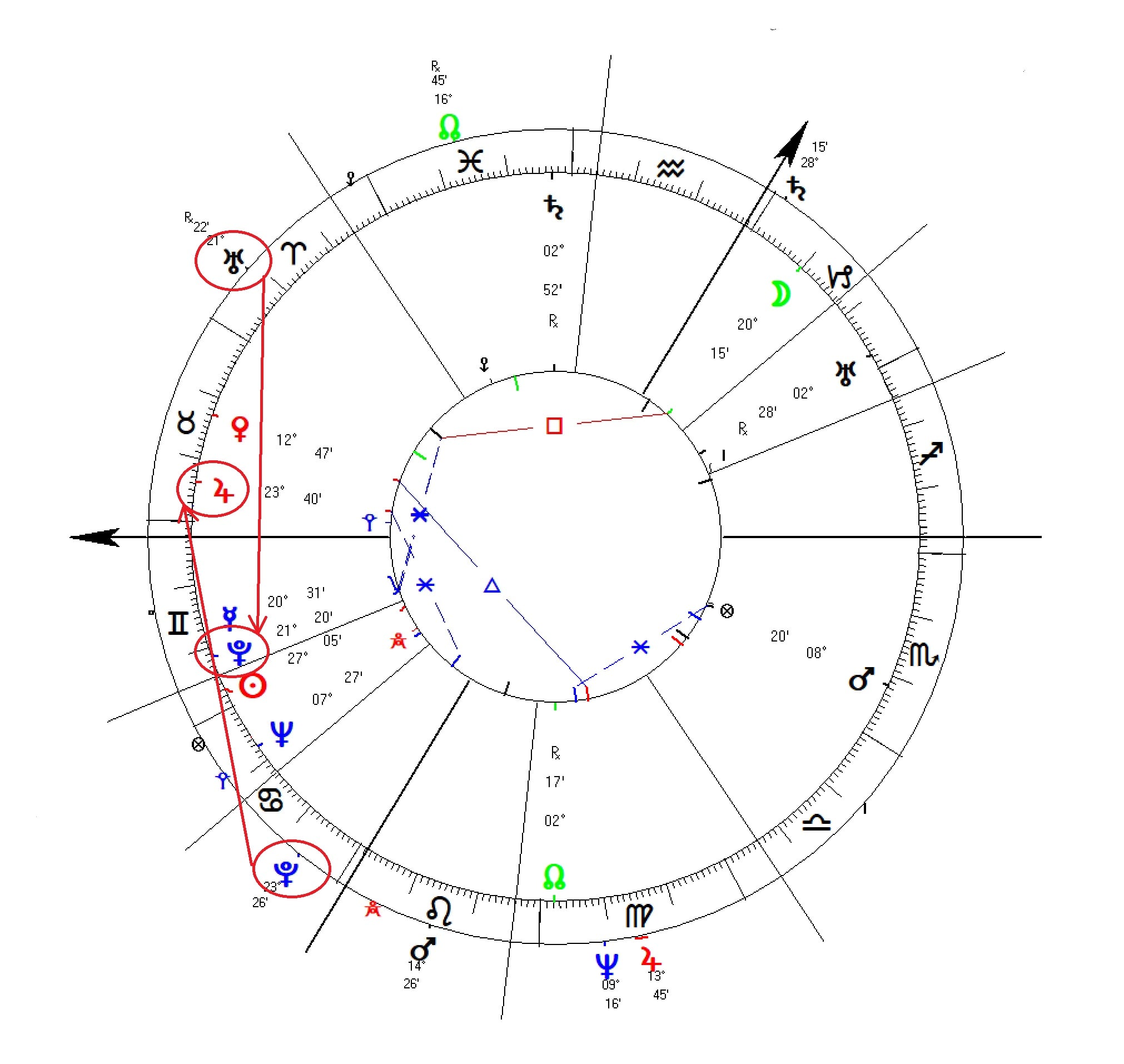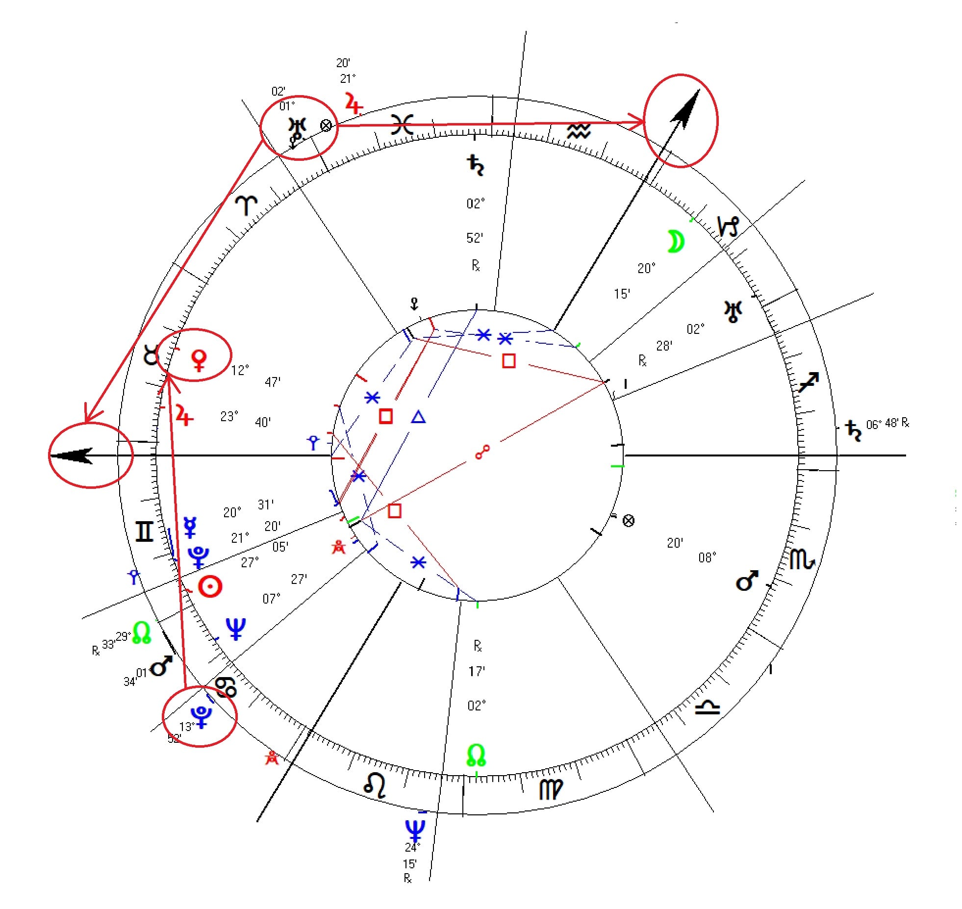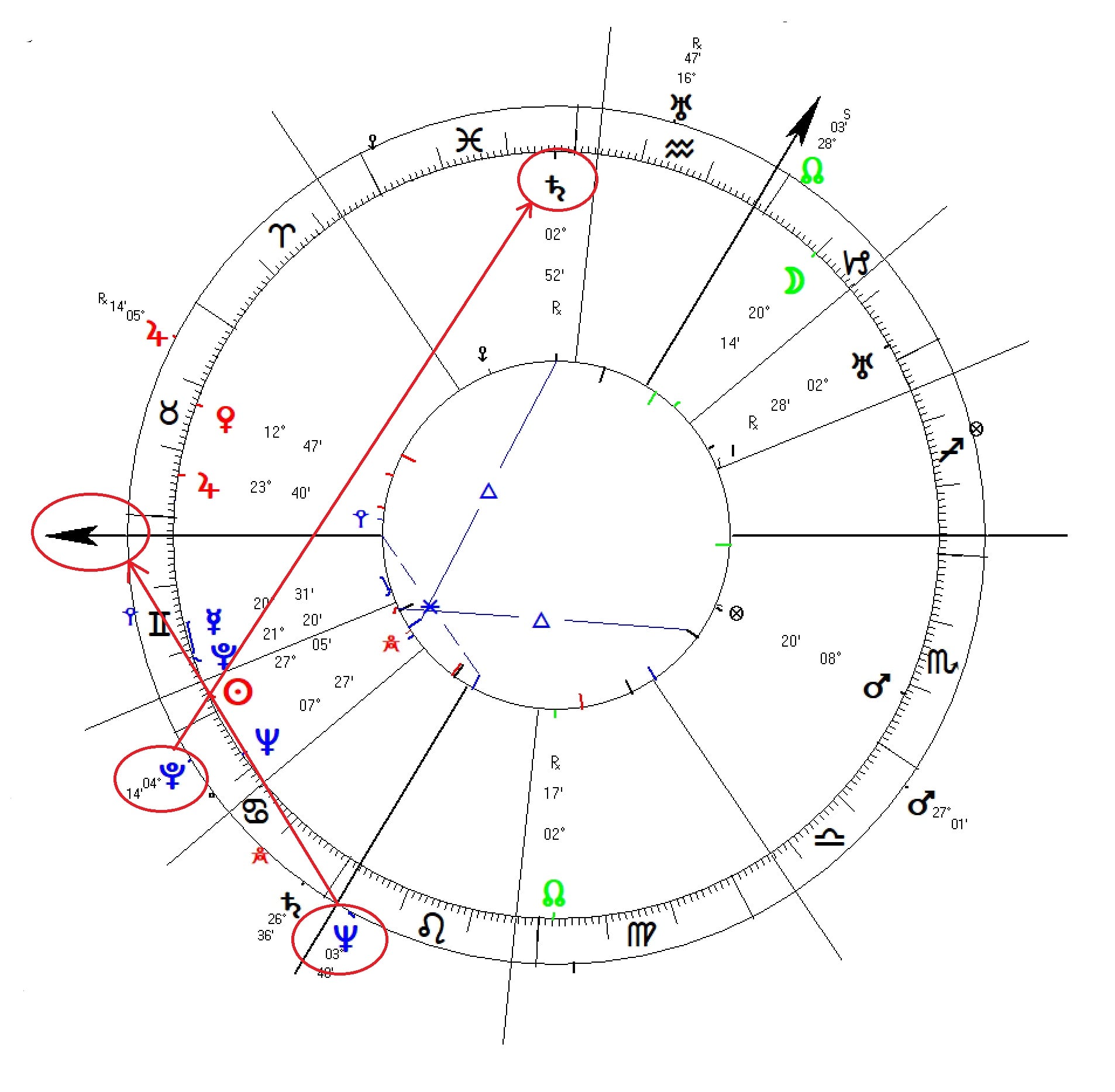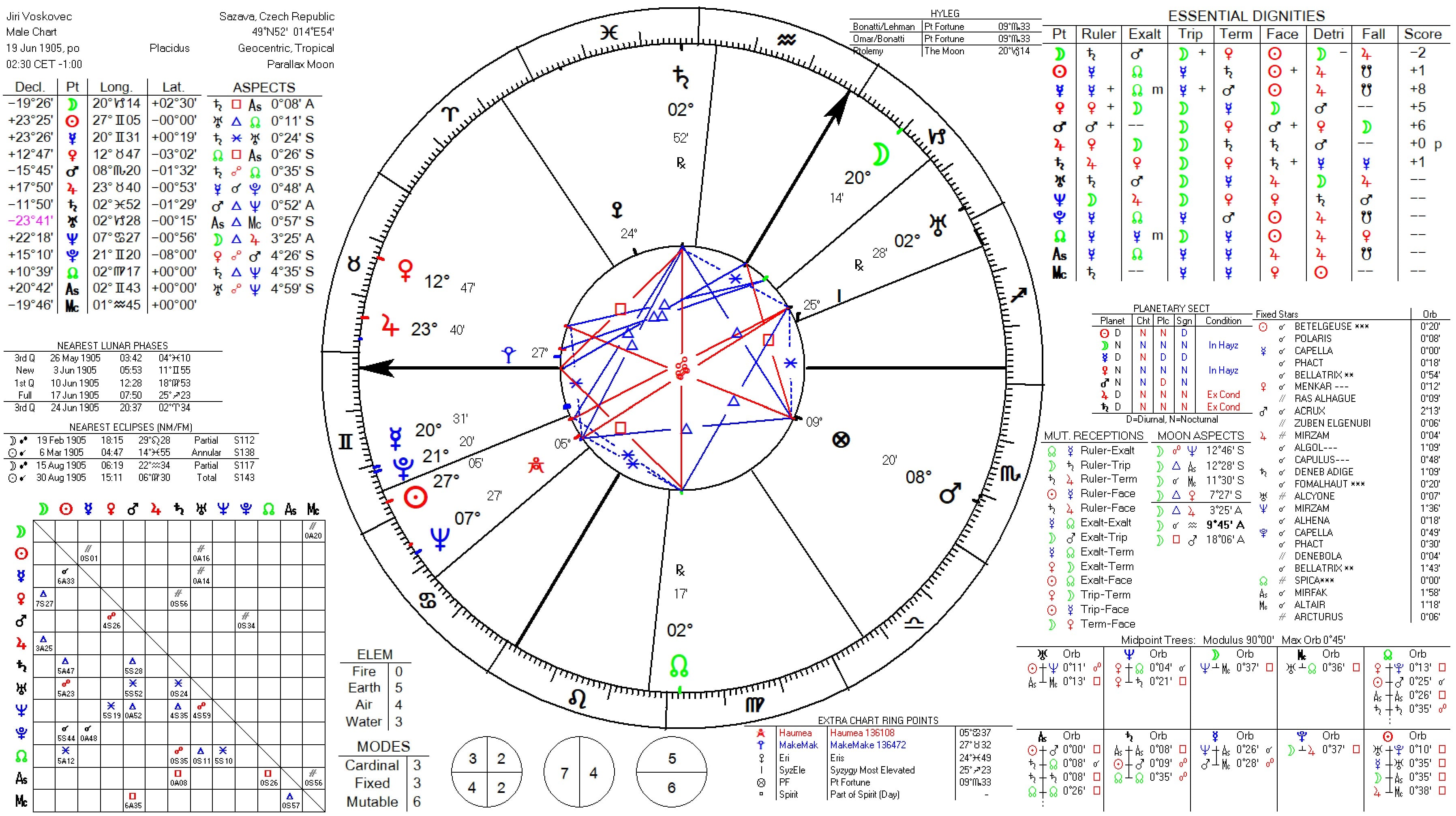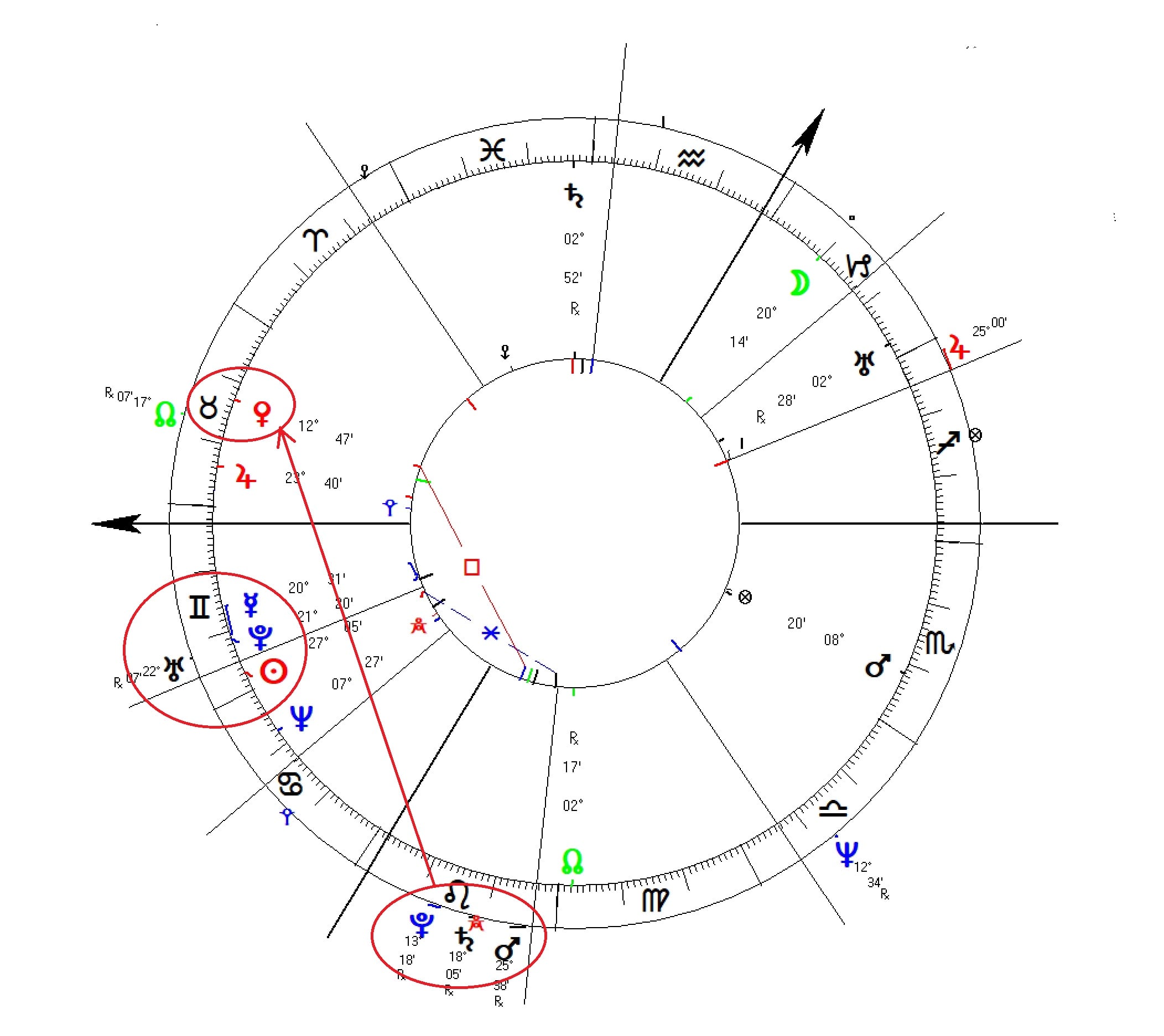 Kde je v horoskopu vidět úspěch a proslulost Jiřího Voskovce? Na první pohled je vidět, že jeho horoskop ukazuje na nesnadný život. Zvláště mládí prožil v turbolentní době, jako kluk zažil první světovou válku, potom vznik Československa, začal tvořit společně s Janem Verichem v meziválečném období, aby pak utekl před nacisty a když se vrátil, přišel pro změnu komunistický převrat. A to vše je v jeho horoskopu vidět. Rány osudu jsou často motorem, který nás žene stále vpřed k vyššímu výkonu. Jiří Voskovec měl Asc. v Blížencích, vládcem Asc. byl tedy Merkur v prvním domě v Blížencích v konjunkci s Plutem a se Sluncem, které vládlo pátému domu. Pátý dům je o tvůrčí činnosti  a Merkur a Blíženci o komunikaci. Spoluvládcem pátého domu byl již zmíněný Merkur. Tři domicilní planety a Saturn v jedenáctém domě na královské stálici Fomalhaut, která dává uznání, vše jen podtrhují.
