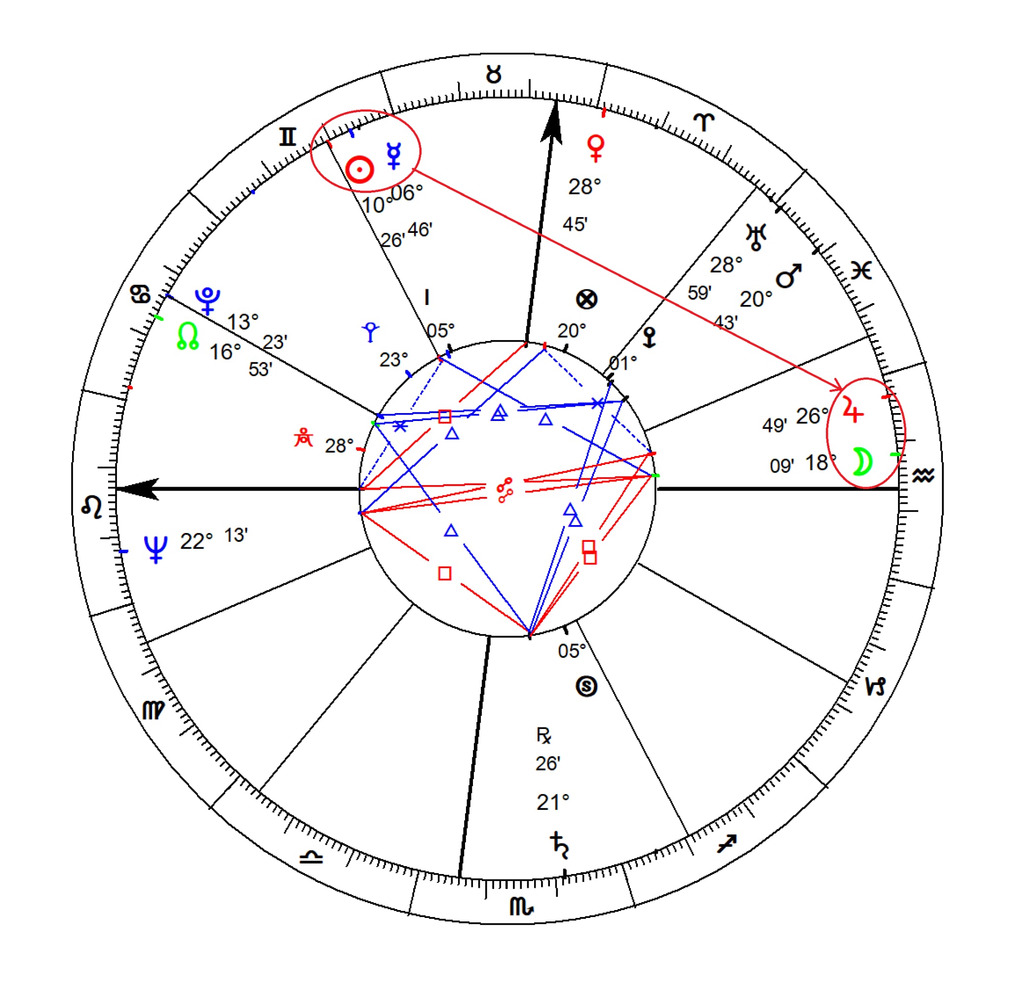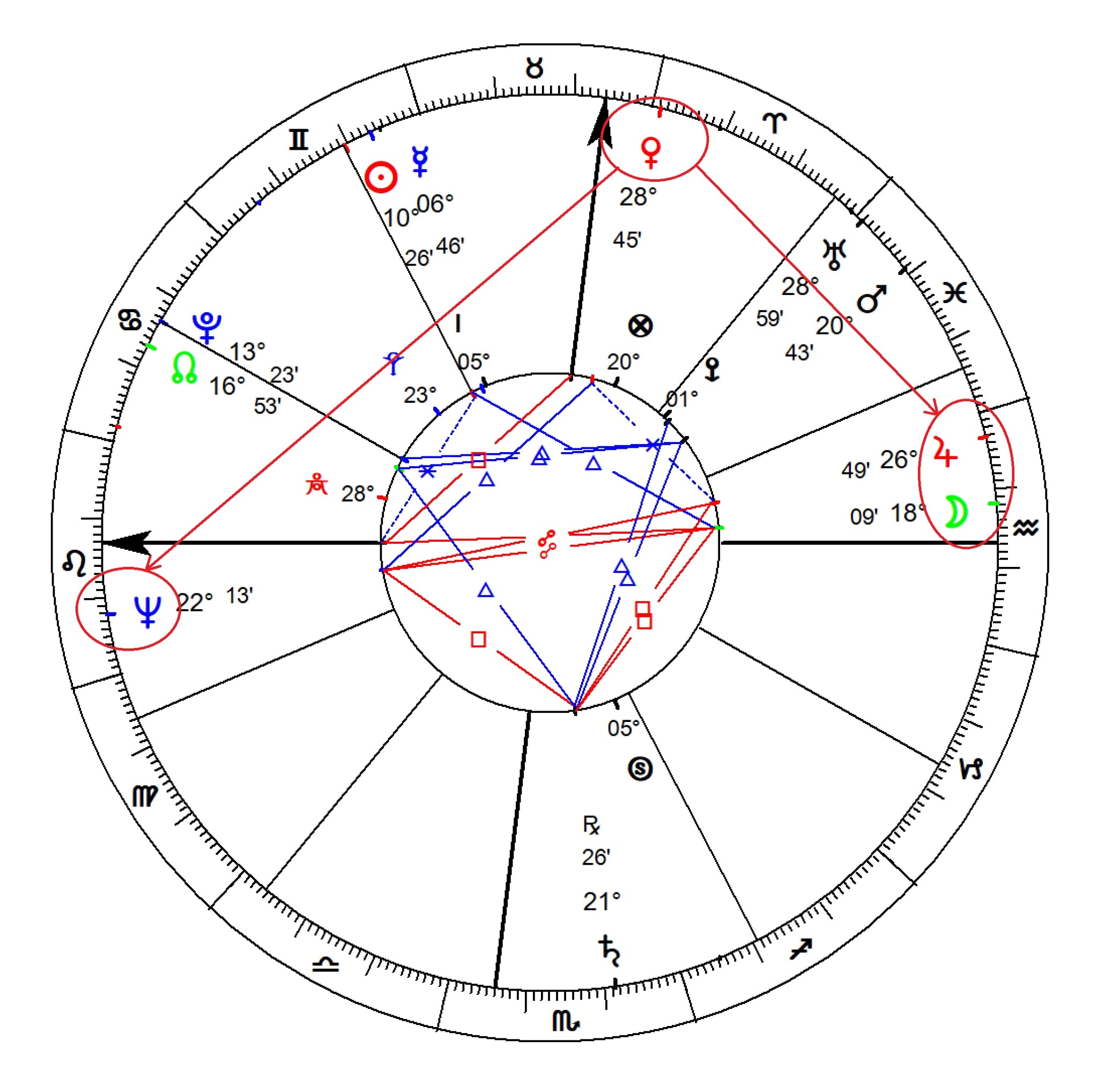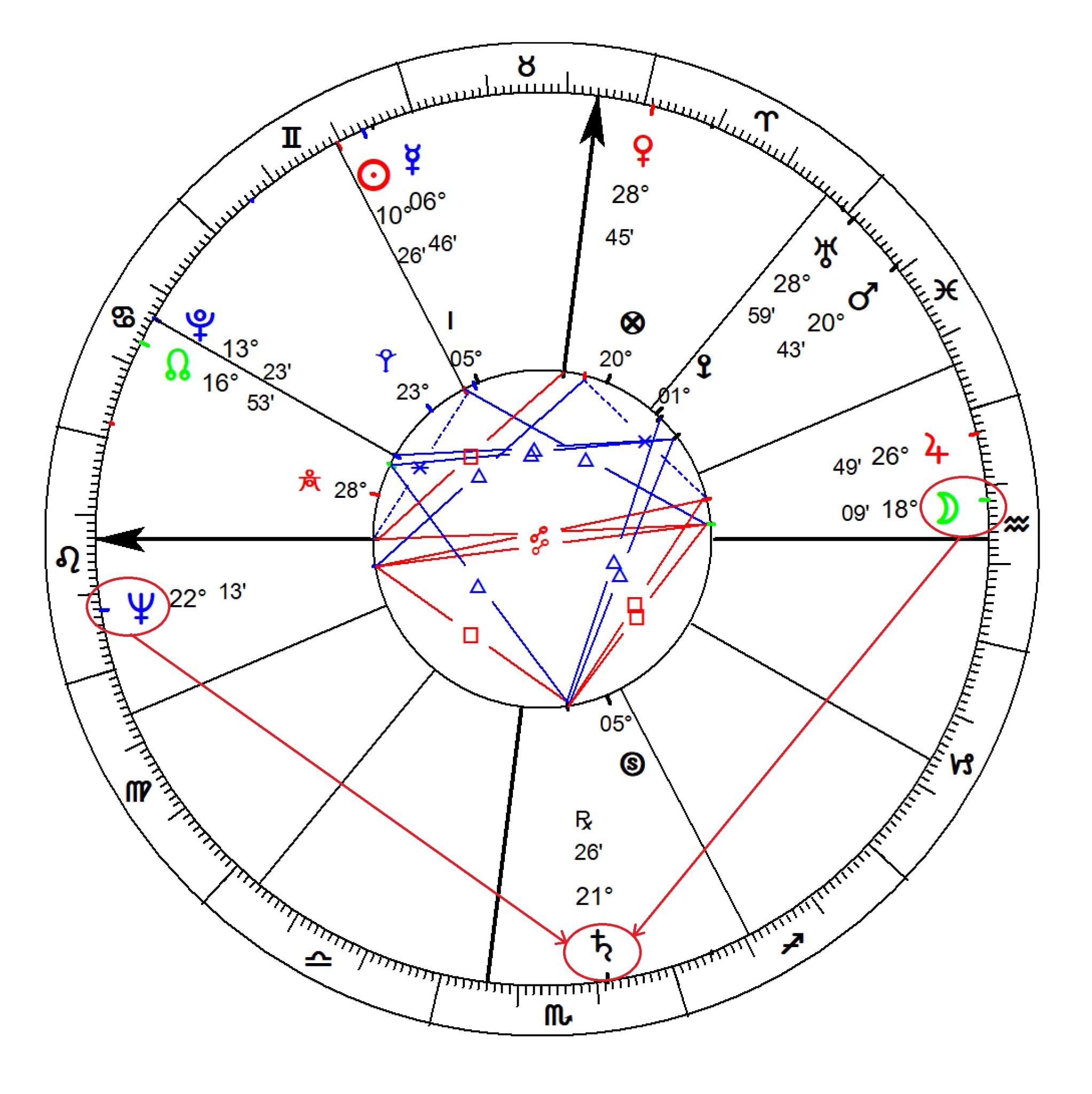 Často se potýkala s depresemi, úzkostmi a závislostí na lécích. (Neptun opozice Luna kvadratura Saturn) viz. první obrázek.
