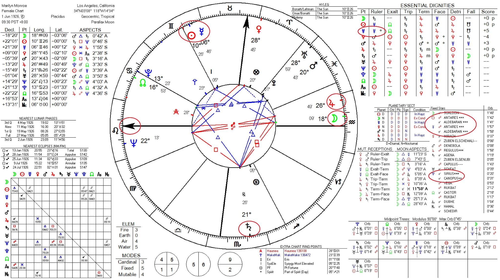 Úspěch v horoskopu Marilyn Monroe: Na první pohled je zřejmé, že se jedná o horoskop úspěšné osoby. Obě světla jsou v mužských znameních, Luna v rohovém domě, vládce ascendentu Slunce na hrotu jedenáctého domu. Planety denní sekty se nacházejí v operativních domech (domicilní Merkur v desítce, Saturn ve čtvrtém domě, Jupiter v sedmém domě) Slunce a Merkur navíc stojí na královské stálici Aldebaran a Pluto na Siriu a Canopu. Součástí doprovodu Sektového světla (Slunce) je nosič kopí Merkur, Venuše, Uran, Mars a Jupiter. Není se čemu divit, že se Marilyn Monroe stala celosvětovou celebritou.